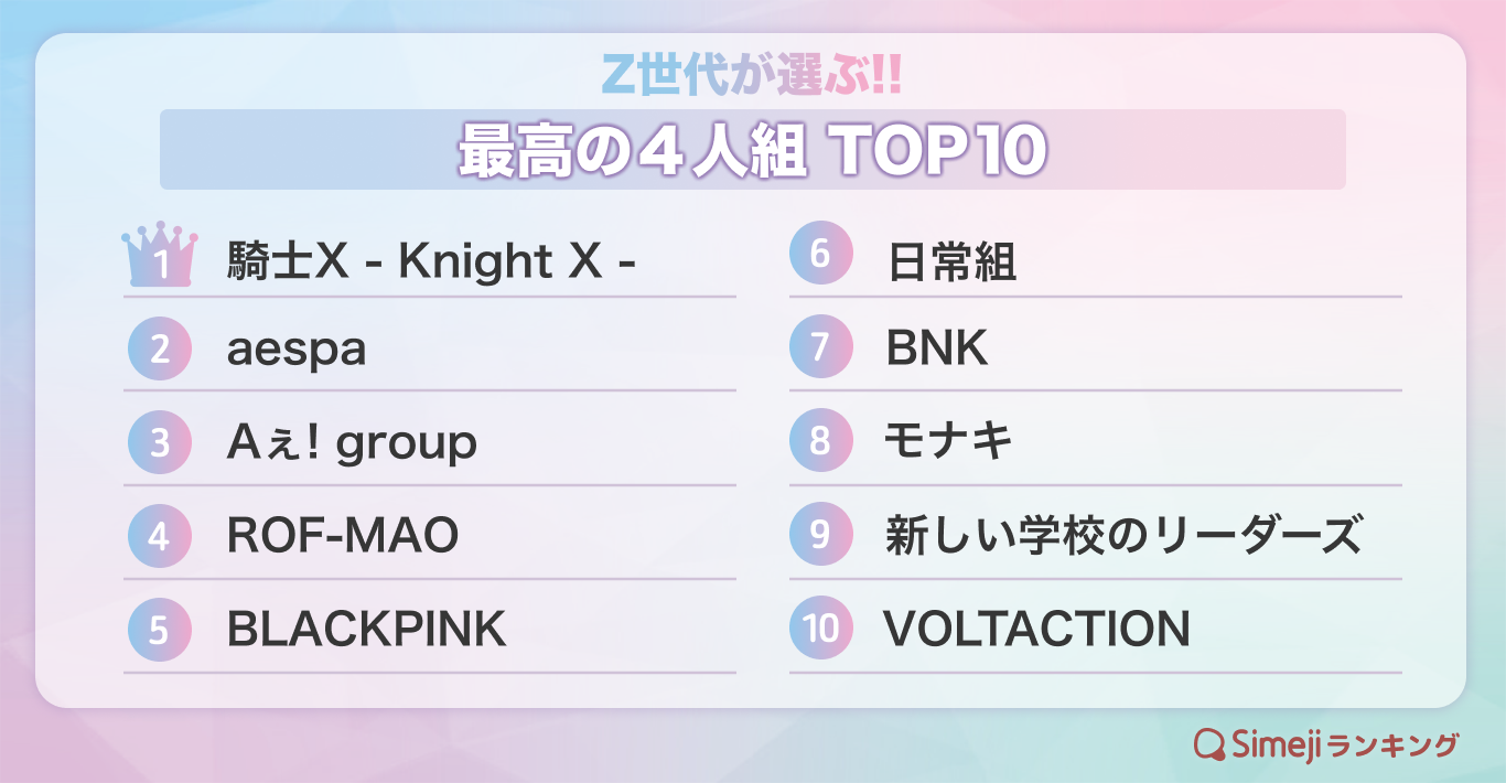 【Simejiランキング】Z世代が選ぶ!!「あなたにとって最高の4人組は?」TOP10