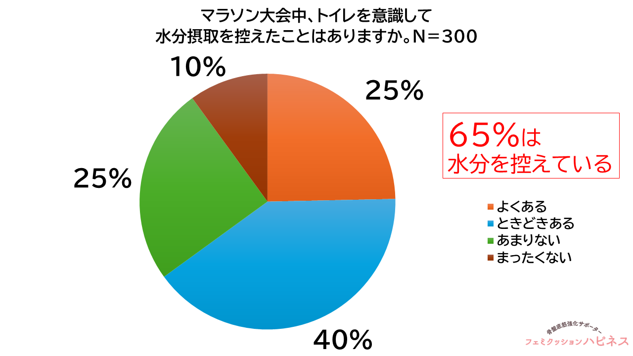 【30代~60代の女性ランナー300名の実態調査】65%がマラソン大会中に水分を控えた経験 4人に1人が尿漏れ経験、半数以上が相談せず